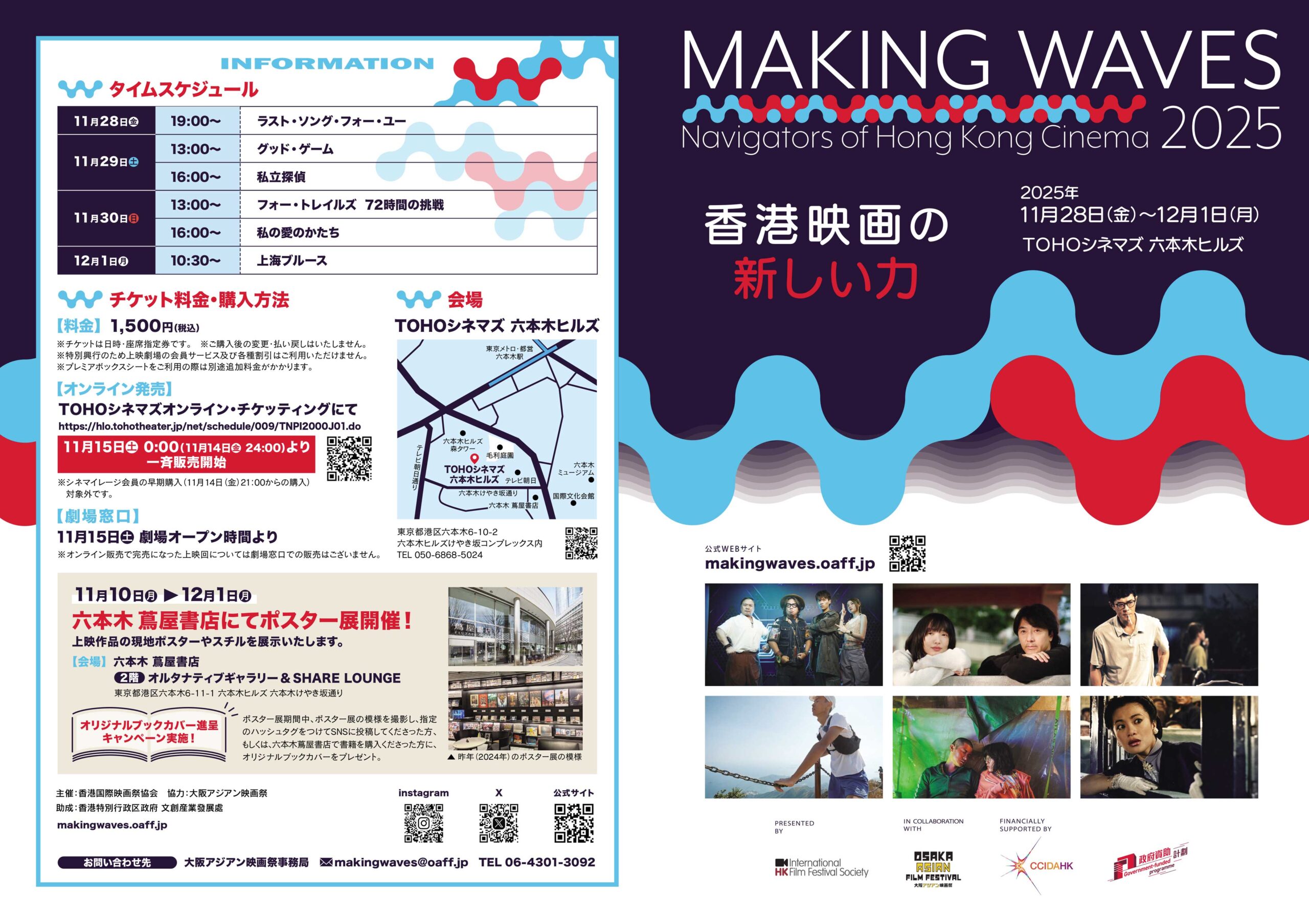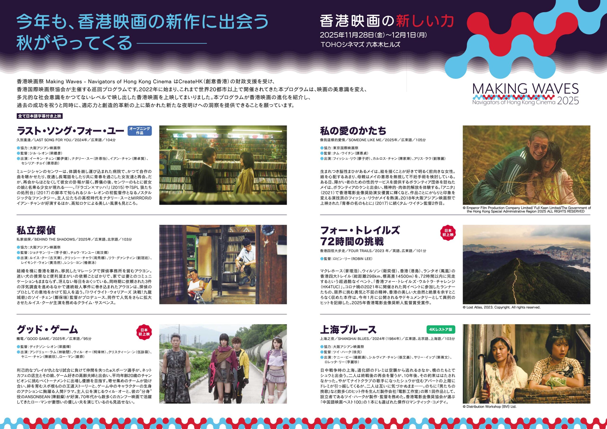香港映画祭2025『Making Waves – Navigators of Hong Kong Cinema 香港映画の新しい力』は、香港特别行政区政府 創意香港の財政支援を受け、香港国際映画祭協会が主催する巡回プログラムです!2022年に始まり、これまで世界20都市以上で開催されてきた香港映画祭は、映画の美意識を変え、多元的な社会意識をかつてないレベルで映し出した香港映画を上映してきました!今回も魅力的な作品が6作品登場し、11/28(金)〜12/1(月)、TOHOシネマズ 六本木ヒルズで4日間上映されます!今年もシカトキノコでポスターやリーフレット、Web制作などの広報ツールを製作させていただきました。昨年も大人気でしたので、ぜひ下記より鑑賞チケットをゲットしてください!