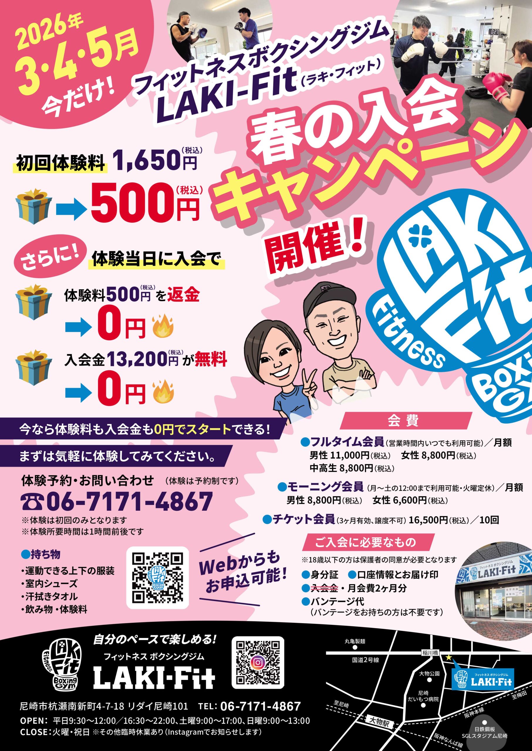 兵庫県尼崎市の「大物駅」にあるフィットネスボクシングジム「LAKI-Fit(ラキ・フィット)」さんの「春の入会キャンペーン」の広報ツールを制作させていただきました。3・4・5月の3ヶ月間限定で、初回体験料が500円になるほか、体験当日の入会で、体験料の返金と入会金が無料になります!会社帰りにフィットネスボクシングで汗を流したり、お昼時間を有効に活用してしっかり運動したり、老若男女が楽しめるジムとなっているのでぜひお気軽に体験してみてください!代表の黒津孝次さんは柔道整復師の資格を持ちつつ、元プロボクサーなので、本格的なボクシングの相談もOK!最新情報はこちらのInstagramを要チェックです!ただいまキャンペーンの体験予約を受付中!!!