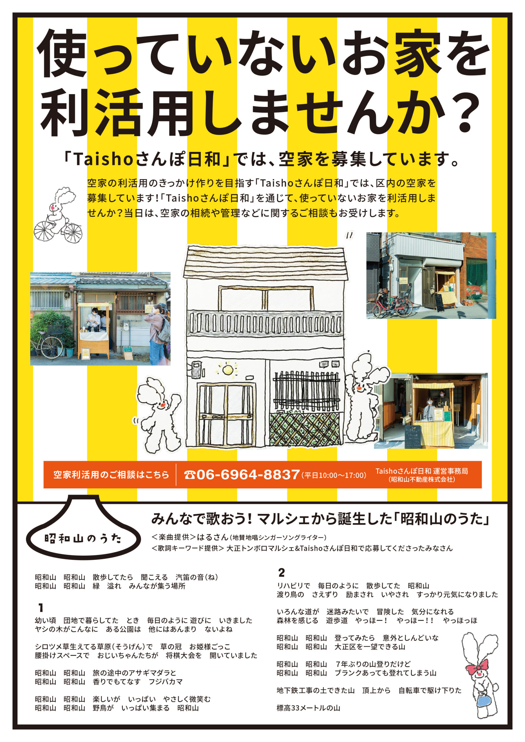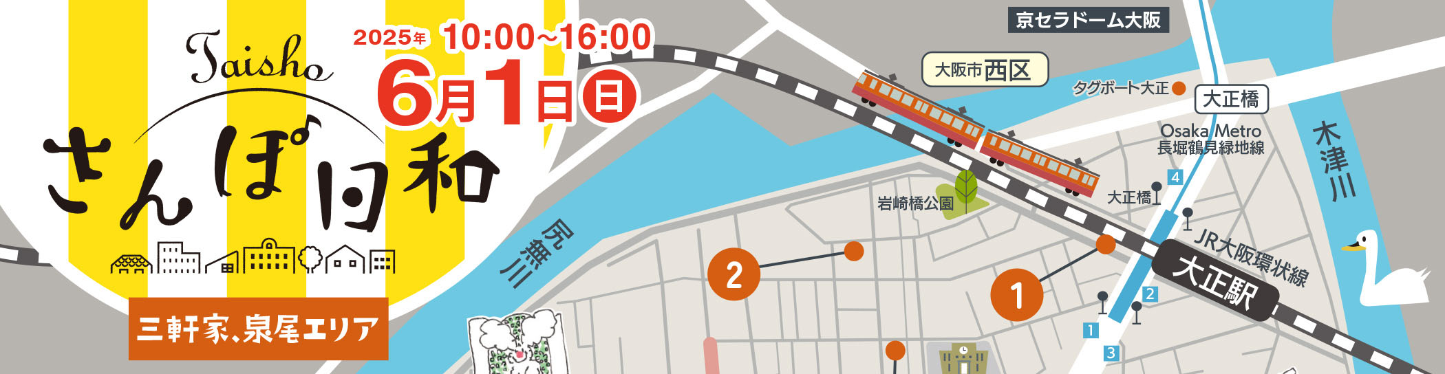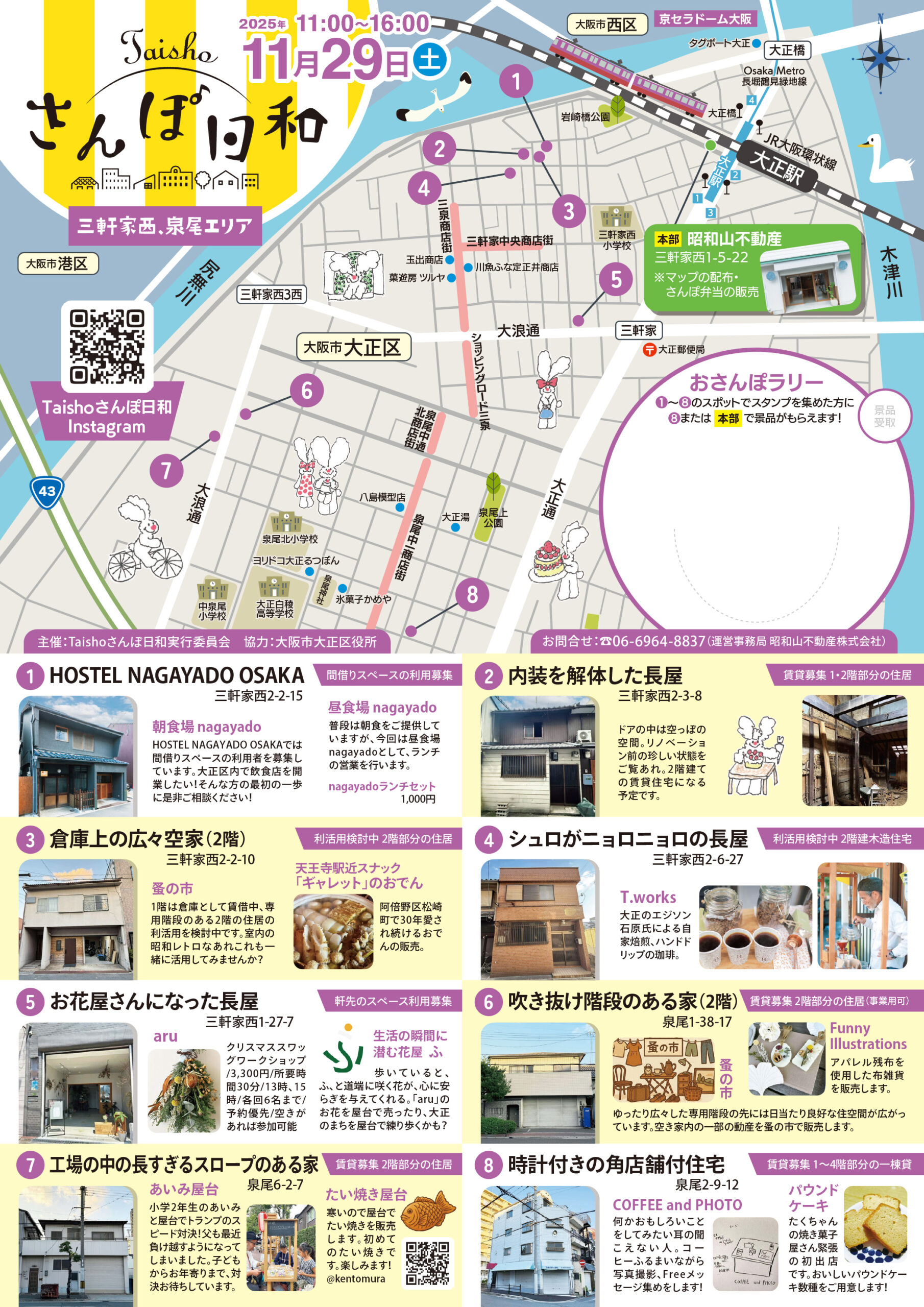 大阪市大正区で令和4年度・5年度と大正区の事業として開催していた、大正トンボロマルシェとTaishoさんぽ日和が実行委員会形式で開催することになってから、今回が3回目となる「Taishoさんぽ日和」。2025年は11月29日(土)11:00〜16:00に開催されます!今回は8つの空き家にいろんな屋台が登場!毎回恒例の「おさんぽラリー」も開催されます!(スタンプがリニューアル!スタンプ8つ集めるとゴールでプレゼントあり!)マーケットには昨年に引き続き、大正のエジソンT.worksさんほか、HOSTEL NAGAYADO OSAKA、昭和山不動産、今回は物件もたくさん登場しています。おさんぽしながら、美味しく楽しいマーケットを楽しみながら、大正の物件見学をしてみませんか? みなさまのお越しお待ちしております!