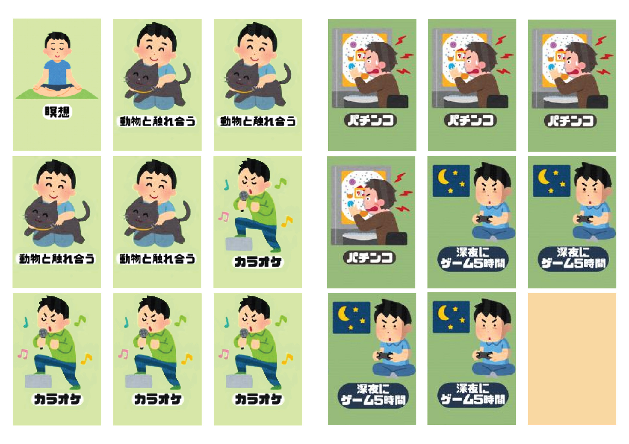 チーム「もう健康じゃん」が考案したSDGs3の「すべての人に健康と福祉を」について考える、ドンジャラをベースにした遊びです。最初に「人物カード」を引いてゲームの主人公を決定。「食事系」「運動系」「睡眠系」「娯楽系」のパイをバランスよく揃えることで上がり特典が増えるなど、楽しみながら、自然と健康意識をあげていくというコンセプトの遊びです!