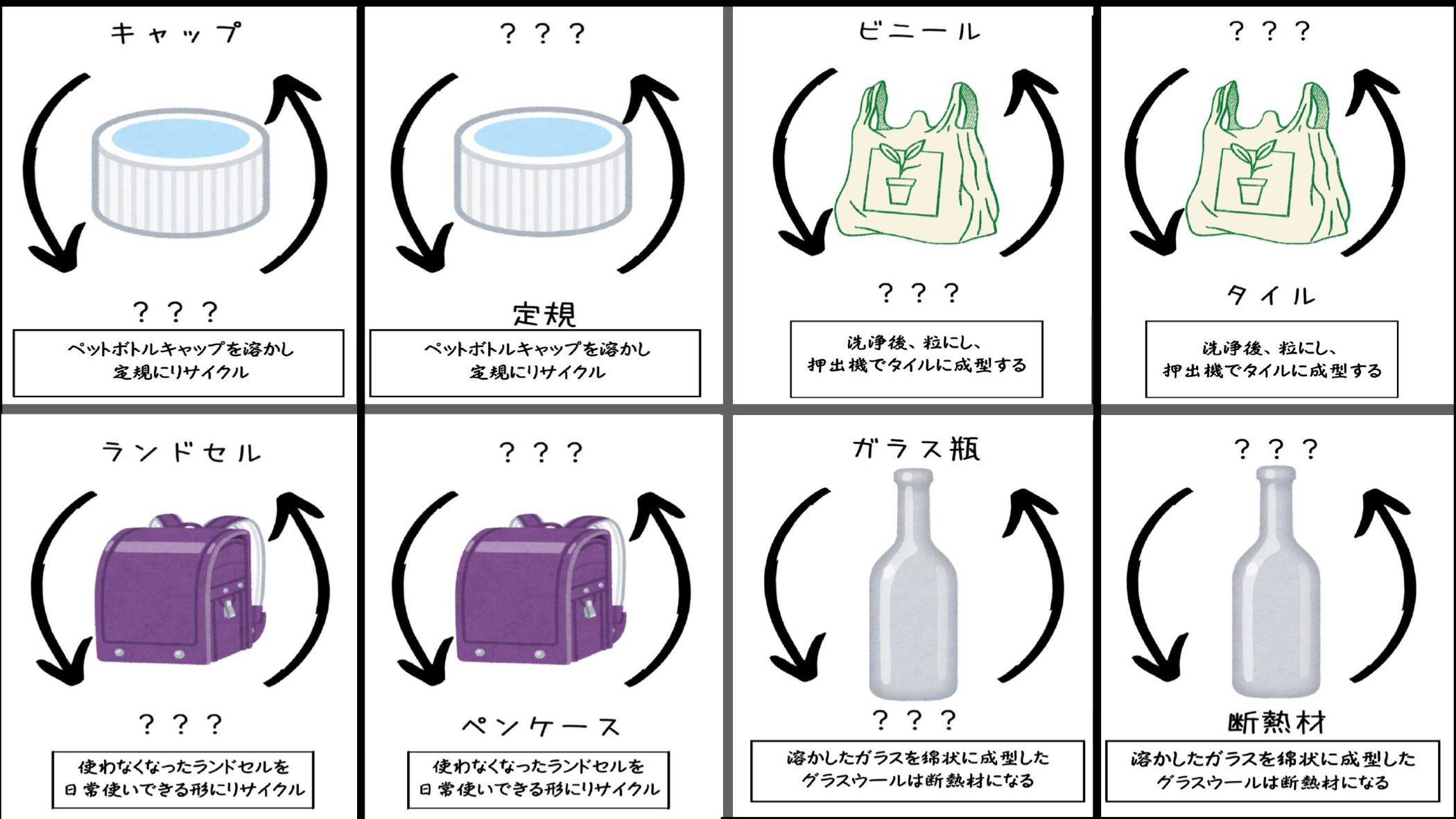 チーム「めい子とゆう司」が考案した、SDGs12の「つくる責任つかう責任」について考える神経衰弱をベースにしたカードゲームです。遊びながらリサイクルを考えることがコンセプトとなり、リサイクルされる素材が書かれたカードを揃えることで、それらが何にリサイクルされるのかということを知ることができます。また揃わなければ1回休みになる「めい子とゆう司カード」や、場のカードがシャッフルされる「たいようといすカード」など特殊カードがあることで学びながら盛り上がれる遊びです!