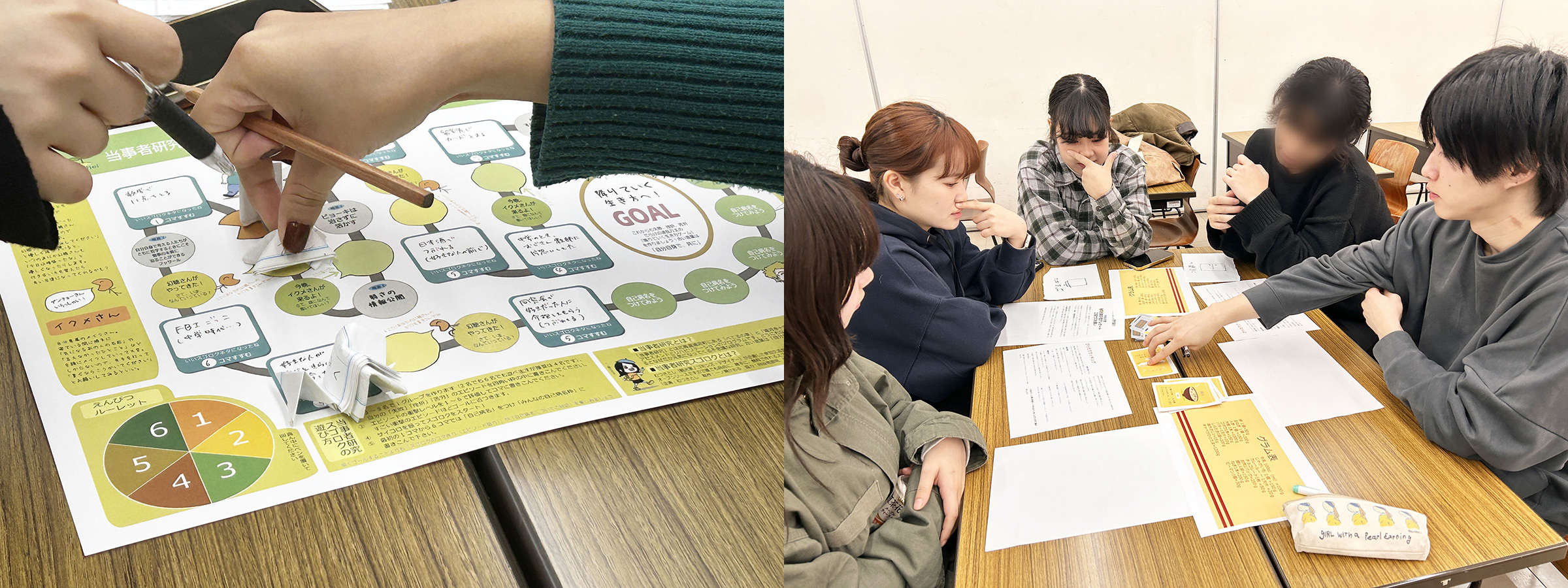 それぞれチーム名を決めた後、ドンジャラやカードゲームなどSDGsをどんな「遊び」に落とし込むかを4回の授業で、企画・検討・考案・試作を行いました。これまでの授業で学んだプロジェクトのプロデュース事例における「遊び心」や、さまざまな「社会課題×遊び」のオープンソースを生み出しているコモンズデザイナー・社会実験者の陸奥賢さん考案の「まわしよみ新聞」「直観讀みブックマーカー」「当事者研究スゴロク」を授業で体験したことを生かし、今年もわずか4回の授業とは思えないクオリティに仕上がりました。その後2回の授業で、各チームプレゼン発表と、他のチームの遊びを実際に遊んでみる体験を行いました!