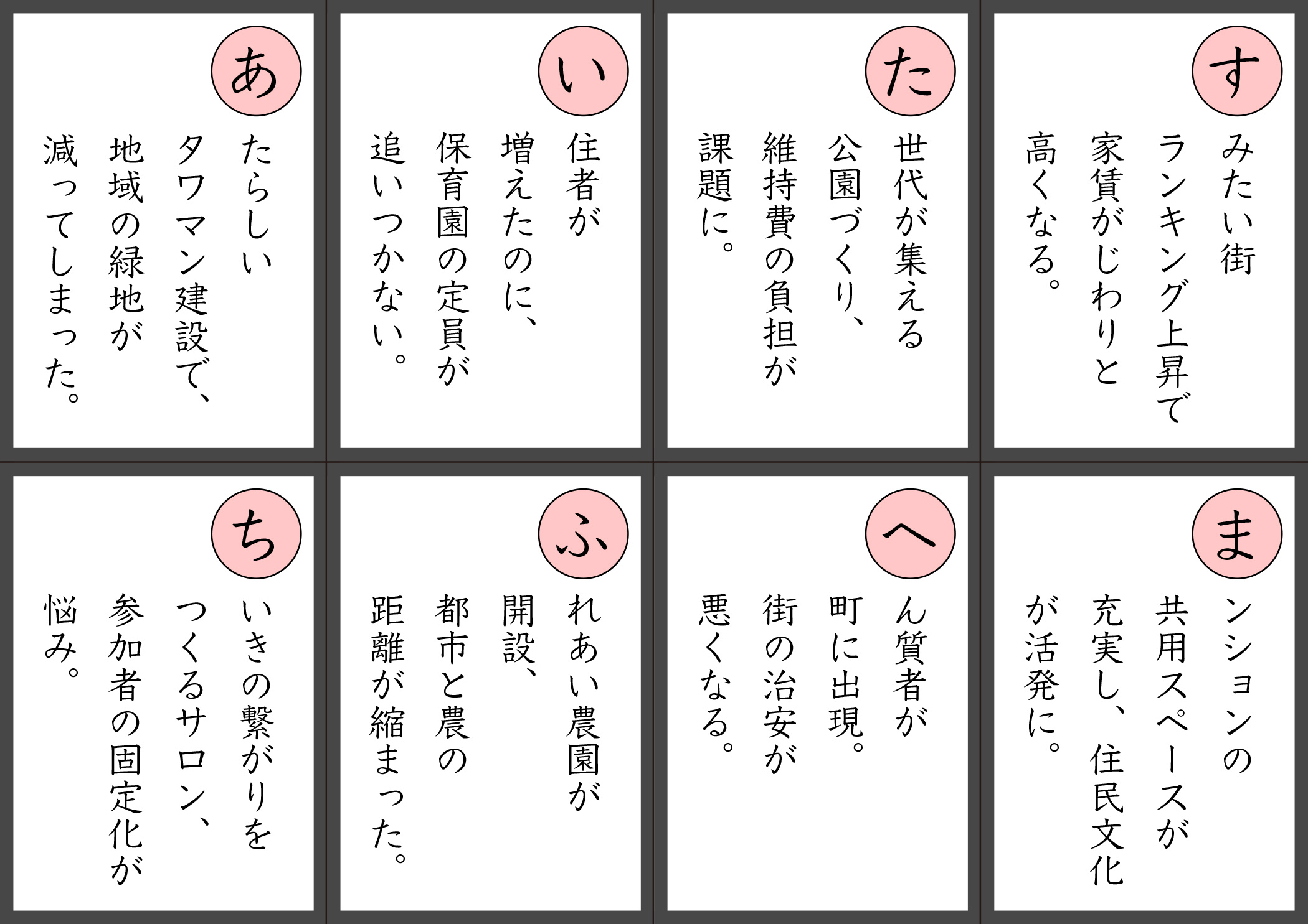 チーム「ずっと暮らし隊」が考案した、SDGs11の「住み続けられるまちづくりを」について考えるカルタをベースにした遊びです。最初に初期値カードを引き、自ら市長としての就任スピーチを行います。初期値カードの条件を満たしながら、カルタを取っていくことで、選び続けるだけでなく、立ち止まって振り返る「まちづくり」を体感できる遊びです!一番になった市長には最後にスピーチの場も用意されています!