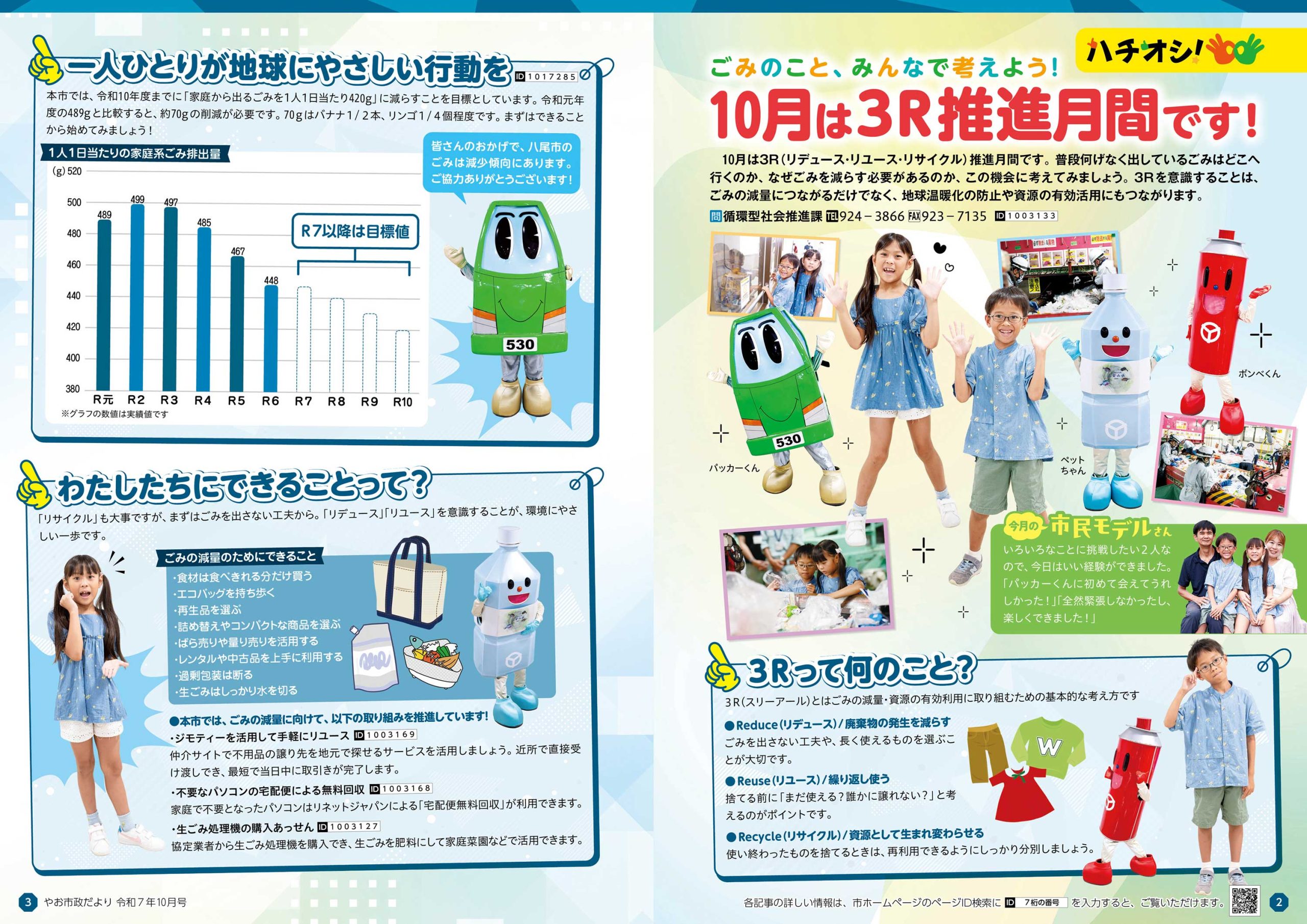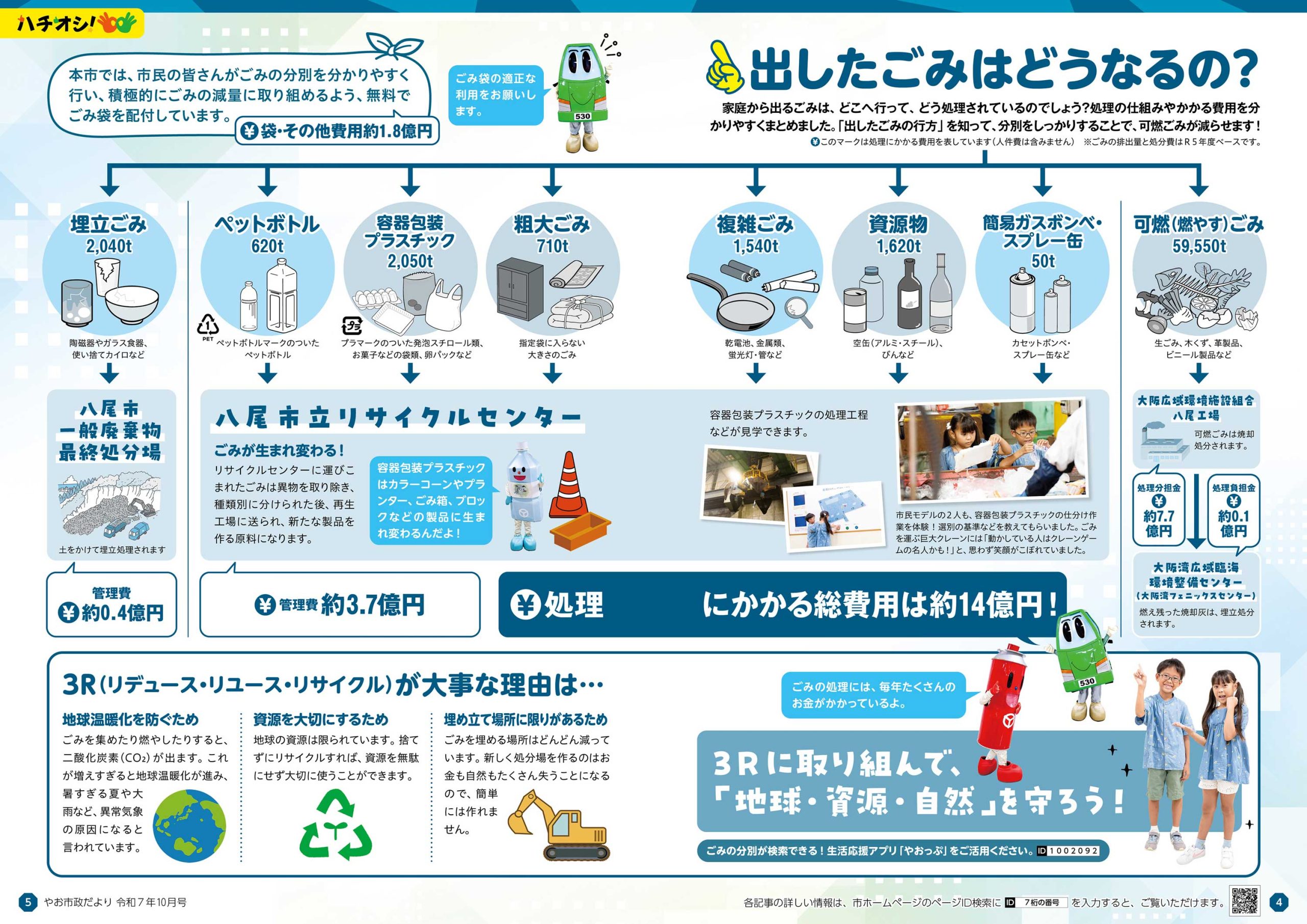 大阪府八尾市の広報紙「やお市政だより」の10月号が発行されました!(令和6年3月号より表紙とP2〜5の巻頭特集4ページのみ、シカトキノコが編集を担当させていただいています)。今月号の表紙は、ごみのこと、みんなで考えよう!10月は3R推進月間です!10月は3R(リデュース・リユース・リサイクル)推進月間。普段何げなく出しているごみはどこへ行くのか、なぜごみを減らす必要があるのかを考える機会です。4・5ページでは「出したごみはどうなるの?」として、家庭から出るごみの行方や処理の仕組み、費用を細かく掲載。意外と知らないごみのことを知ることで、一人ひとりが意識して地球のためにできることに取組みましょう!「やお市政だより」は八尾市民の皆さんに全戸配布しているほか、八尾市役所でも配架していますのでぜひお手に取ってみてください。次号もお楽しみに!