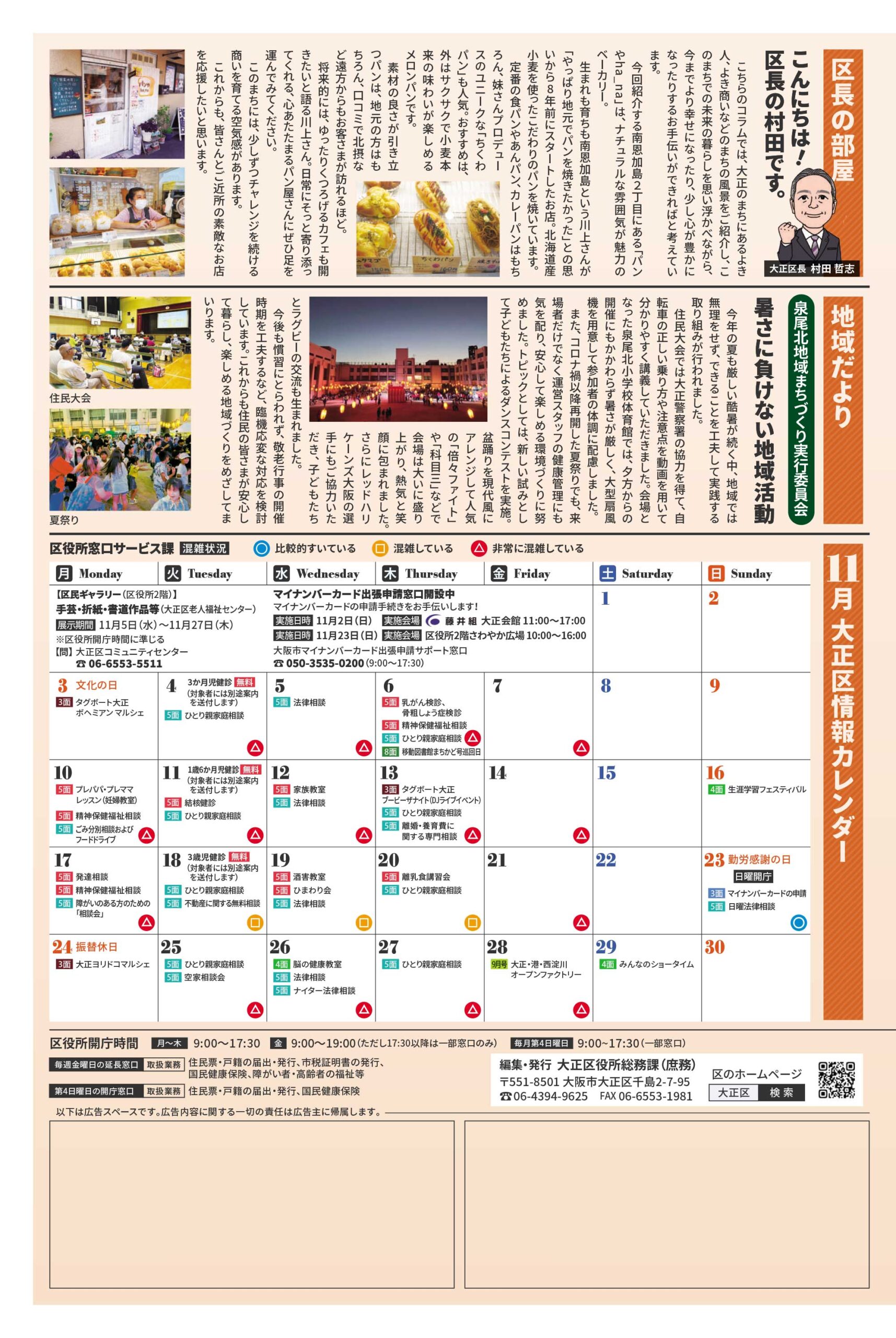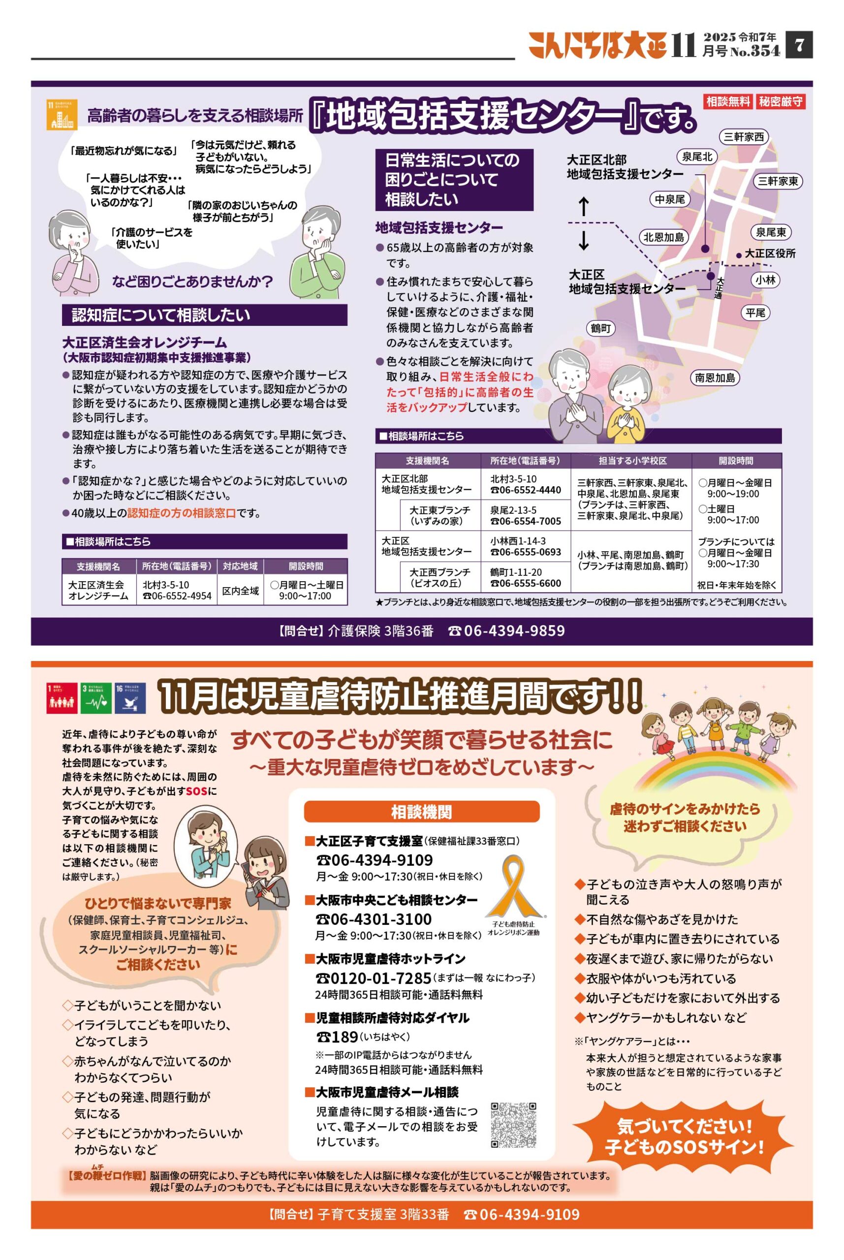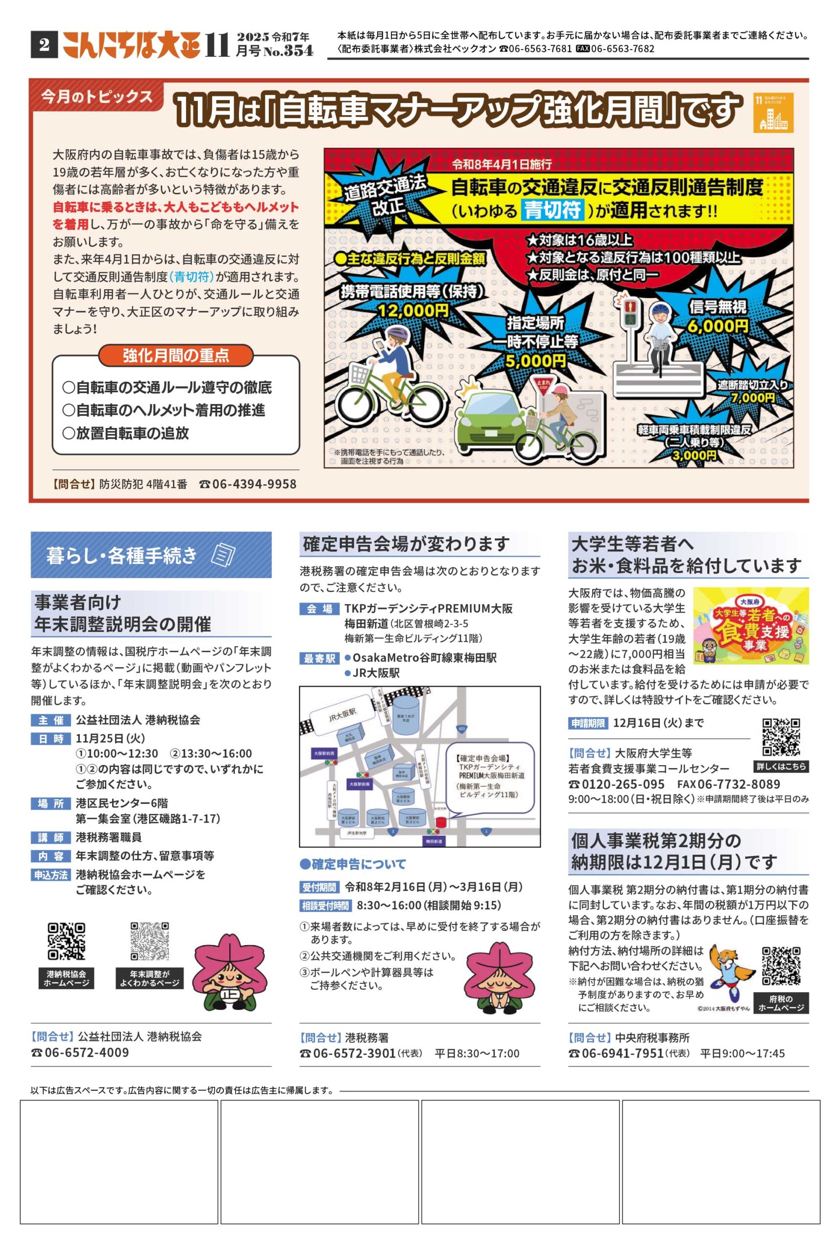 大阪市大正区で毎月発行される広報紙「こんにちは大正」。今月の表紙・2面は〈自転車はルールとマナーを守って安全に!〉。来年4月1日から、自転車の交通違反に対して交通反則通告制度(青切符)が適用されます。自転車に乗るときは、大人もこどももヘルメットを着用し、万が一の事故から「命を守る」備えを!6面は「人生会議」について掲載。前もって、希望する医療やケアについて家族や医師などと話し合い、共有しておくことをおすすめしています。7面は「地域包括支援センター」のご紹介と、「11月は児童虐待防止推進月間」についてを掲載。重大な児童虐待ゼロをめざし、一人ひとりができることを改めて考えたいですね!「こんにちは大正区」では、区民の皆さんから、おすすめの人や風景・お気に入りのお店などを募集していますのでぜひこちらからご応募ください! また、広報紙に関する感想アンケートも実施していますのでぜひいろんな声をお届けくださいね! 広報紙は区民のみなさまに全戸配布しているほか、大正区役所にも設置していますのでぜひご覧ください!