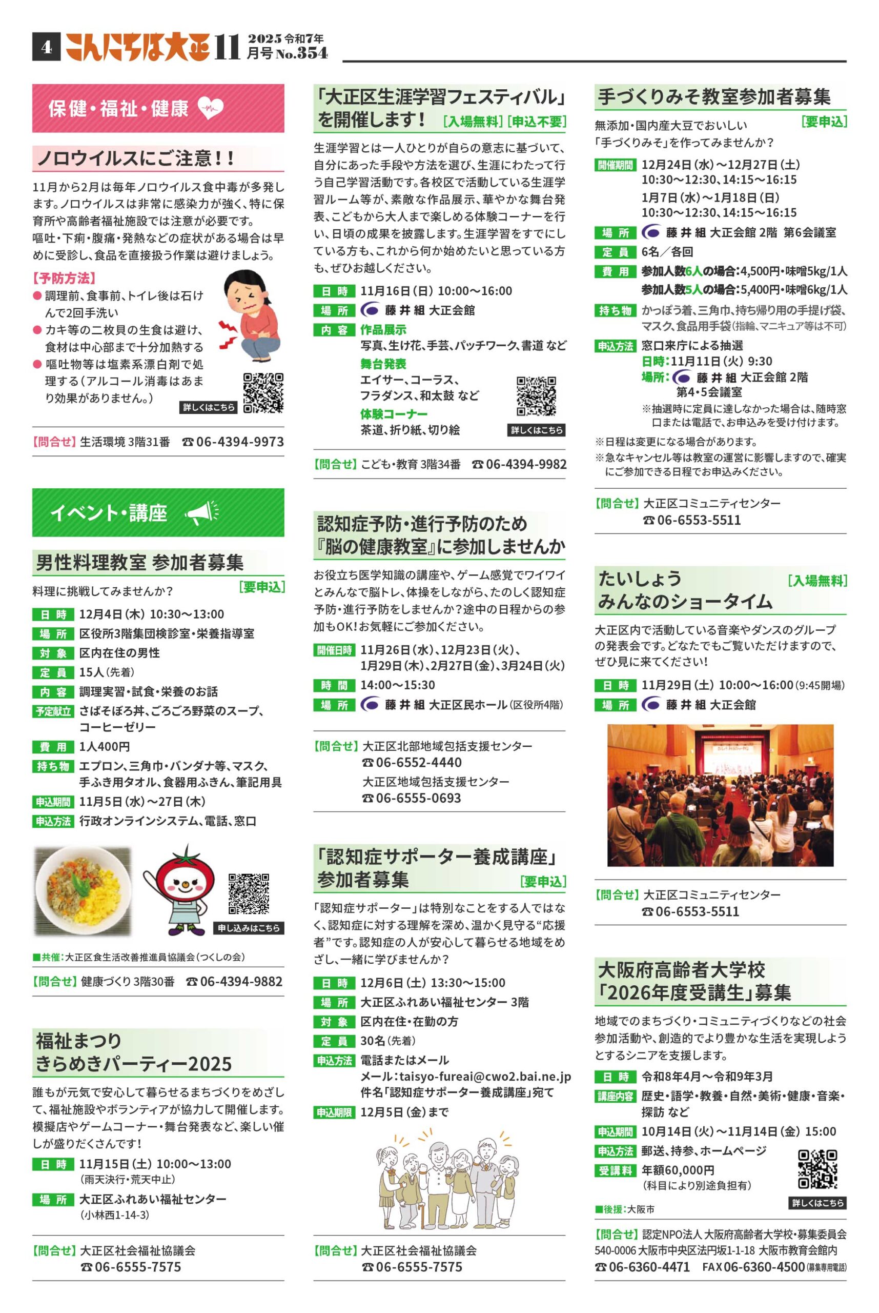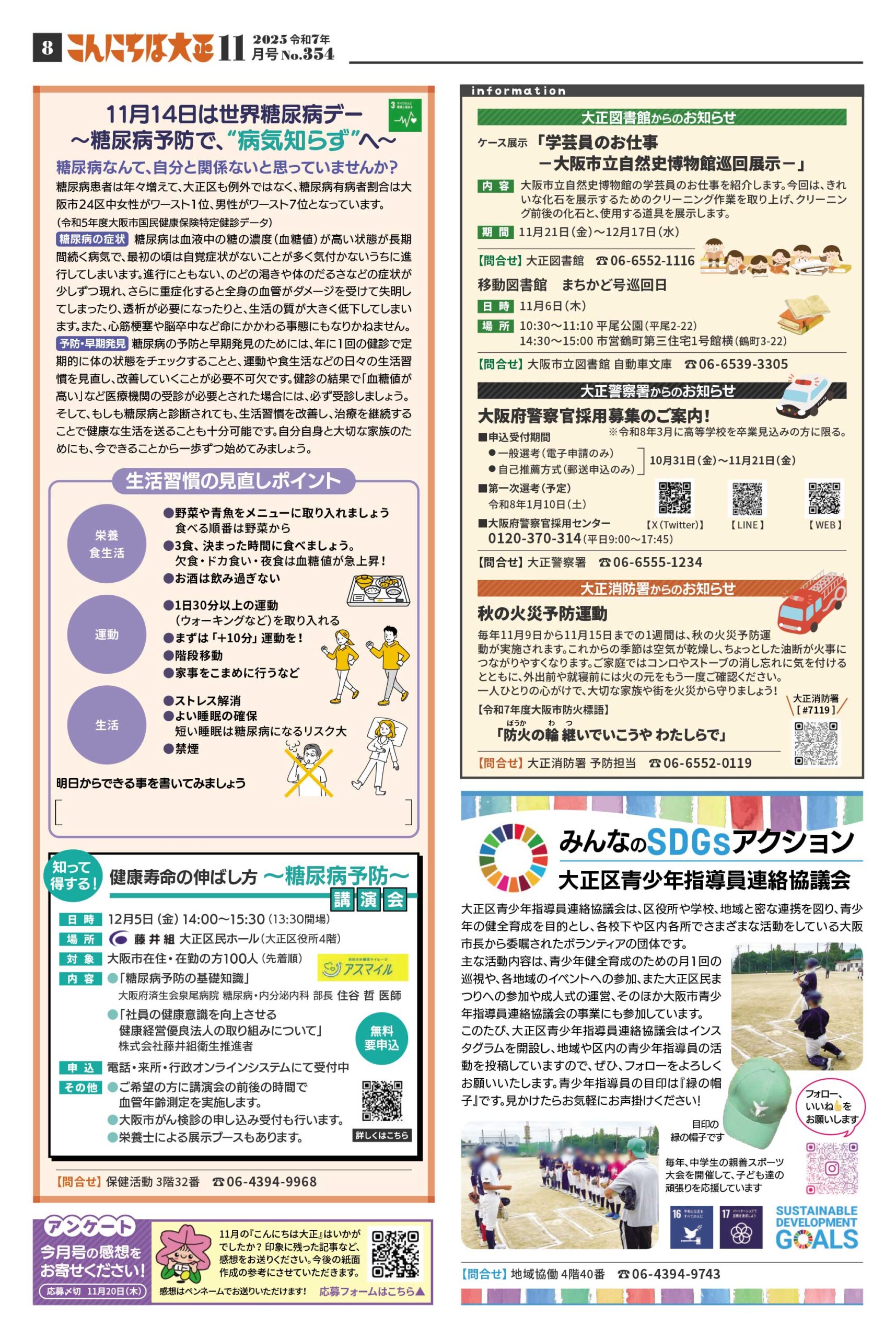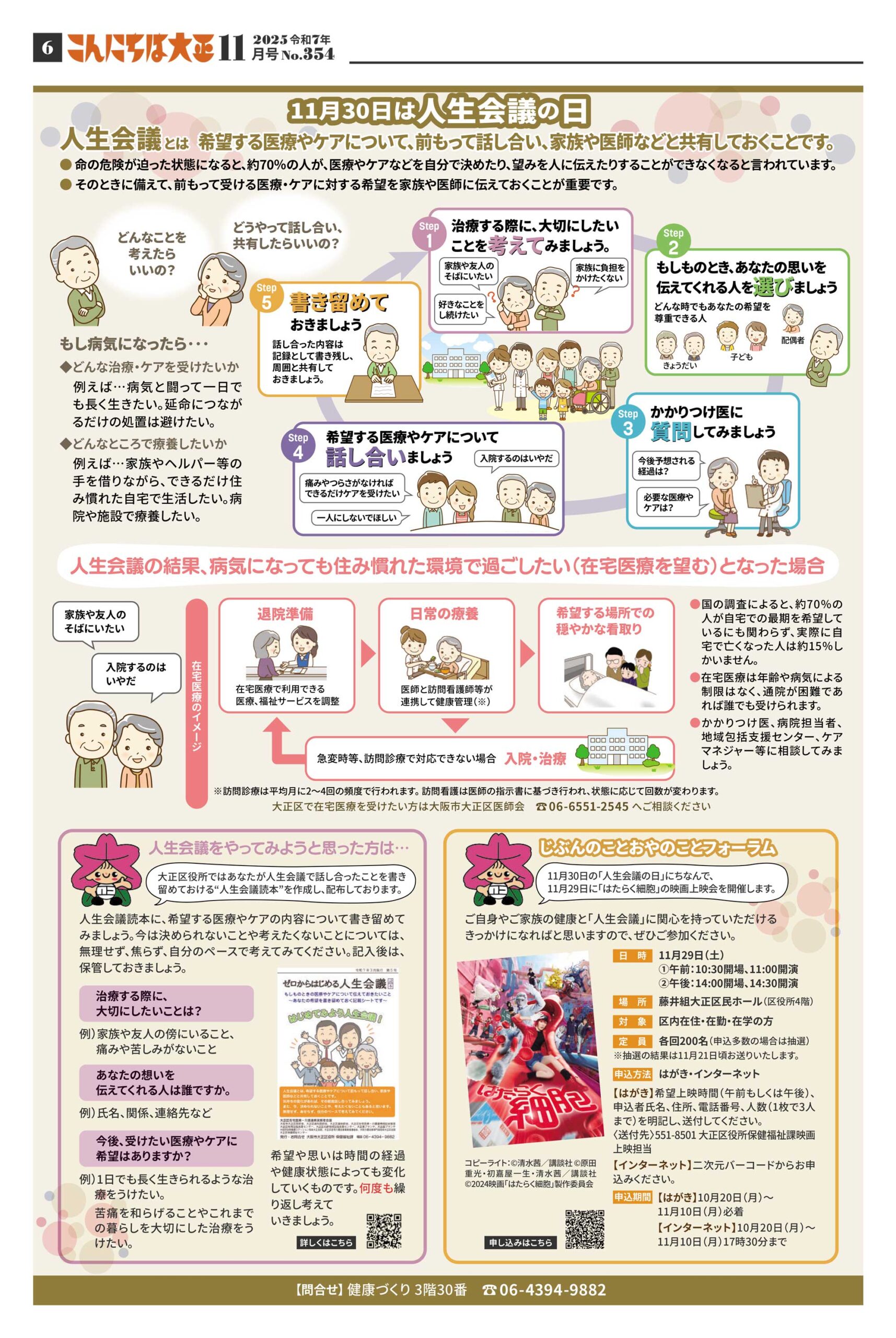 大阪市大正区で毎月発行される広報紙「こんにちは大正」。今月の表紙・2面は〈自転車はルールとマナーを守って安全に!〉。来年4月1日から、自転車の交通違反に対して交通反則通告制度(青切符)が適用されます。自転車に乗るときは、大人もこどももヘルメットを着用し、万が一の事故から「命を守る」備えを!6面は「人生会議」について掲載。前もって、希望する医療やケアについて家族や医師などと話し合い、共有しておくことをおすすめしています。7面は「地域包括支援センター」のご紹介と、「11月は児童虐待防止推進月間」についてを掲載。重大な児童虐待ゼロをめざし、一人ひとりができることを改めて考えたいですね!「こんにちは大正区」では、区民の皆さんから、おすすめの人や風景・お気に入りのお店などを募集していますのでぜひこちらからご応募ください! また、広報紙に関する感想アンケートも実施していますのでぜひいろんな声をお届けくださいね! 広報紙は区民のみなさまに全戸配布しているほか、大正区役所にも設置していますのでぜひご覧ください!