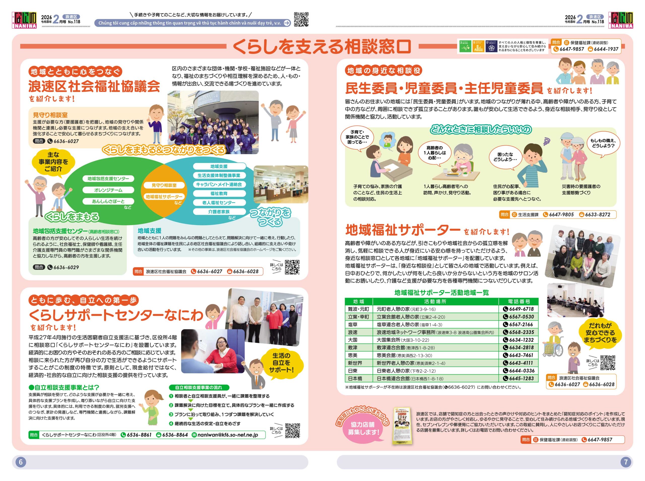 大阪市浪速区で毎月発行される広報紙「広報なにわ」。今月の表紙は、あなたの“困ったご相談ください!です。さまざまな困りごとを相談できる浪速区の相談窓口。相談したら意外と簡単に解決するかも!まずは気軽に相談してみましょう!6・7面は、くらしを支える相談窓口として、浪速区社会福祉協議会、くらしサポートセンターなにわ、民生委員・児童委員・主任児童委員、地域福祉サポーターなど地域に密着してサポートしている相談窓口を掲載。暮らしに関わることなら何でも相談できるので、ぜひ頼ってみてください!「ヘッダーには新たな試みである外国語での広報紙案内を掲載。今月は「ベトナム語」です!広報紙に関する感想アンケートも実施していますのでぜひいろんな声をお届けくださいね! 広報紙は新聞折込のほか、浪速区役所にも設置していますのでぜひご覧ください!